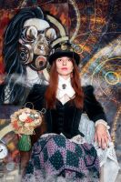 Sur le mur derrière elle, trois de ses peintures les plus récentes attirent l'attention. À gauche, un homme au visage masqué par un chapeau melon et des lunettes à verres teintés semble observer le spectateur avec une curiosité presque inquiétante. Au centre, une femme portant un masque à gaz, symbole de résilience et de mystère, émerge d'un tourbillon de couleurs chaudes et froides. À droite, un crâne mécanique, mi-humain mi-machine, semble murmurer des secrets oubliés.