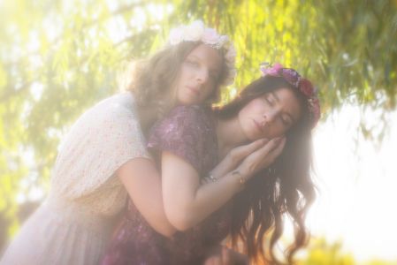 Alors qu'elles avançaient, le soleil commença à descendre lentement à l'horizon, teintant le ciel de nuances de rose et d'or. Les ombres s'allongeaient, et une brise légère commença à souffler, apportant avec elle une sensation de paix et de tranquillité. Les filles s'arrêtèrent près d'un grand saule pleureur, dont les branches tombaient gracieusement dans l'eau.