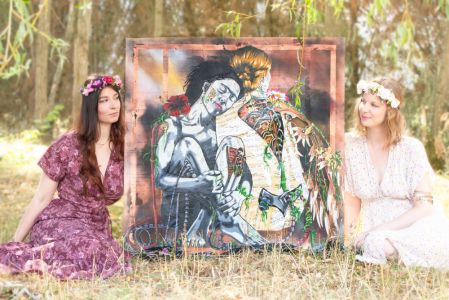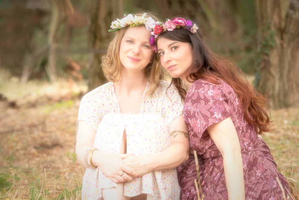 Un jour d'été particulièrement ensoleillé, Lana décida de se promener avec Jasmijn le long de la rivière qui serpentait à travers les champs. Elle portait une robe pourpre qui contrastait magnifiquement avec la robe sombre de Jasmijn. Alors qu'ils avançaient lentement, profitant de la douceur du jour, Lana entendit un rire cristallin derrière elle. Elle se retourna et vit sa meilleure amie, Annabelle, s'approcher d'eux. Annabelle, vêtue d'une robe blanche ornée de fleurs délicates, avait les cheveux parés d'une couronne de fleurs blanches qui ajoutait une touche de magie à son apparence.