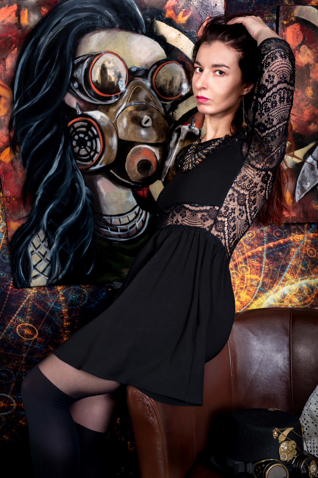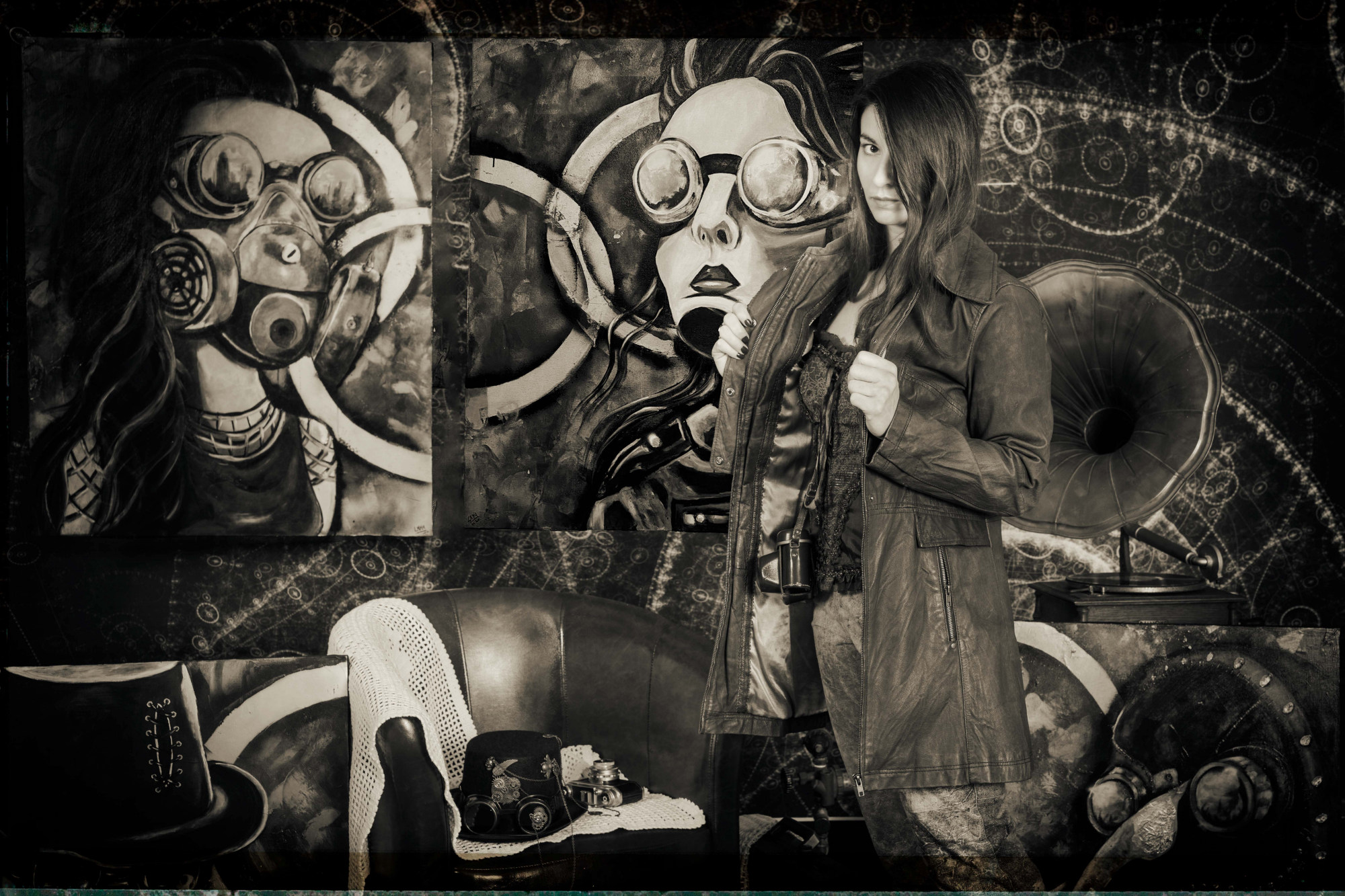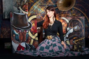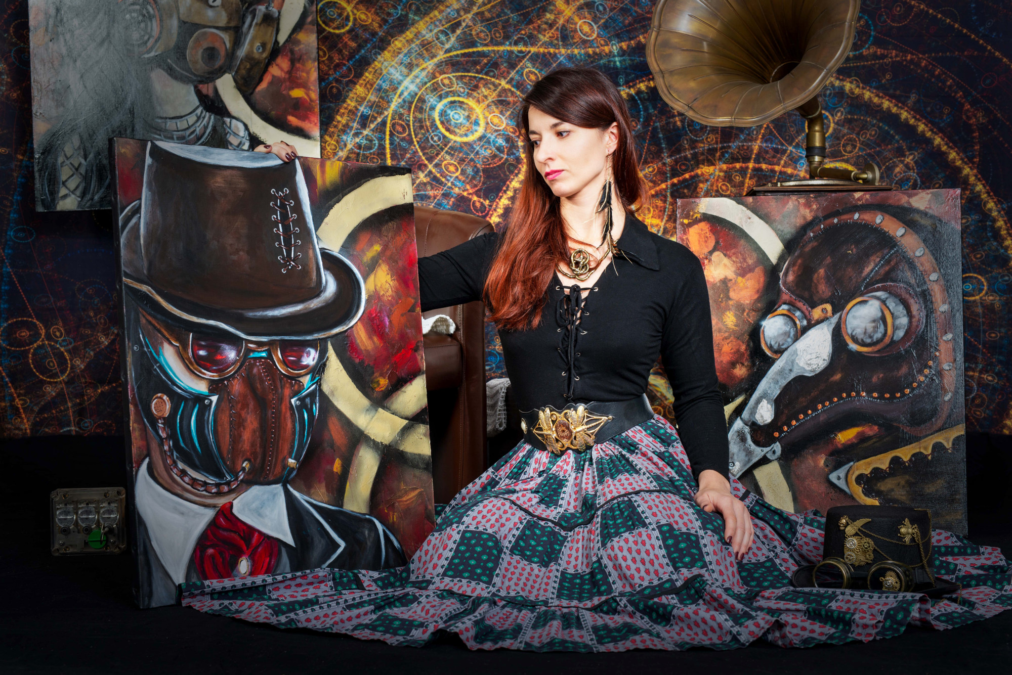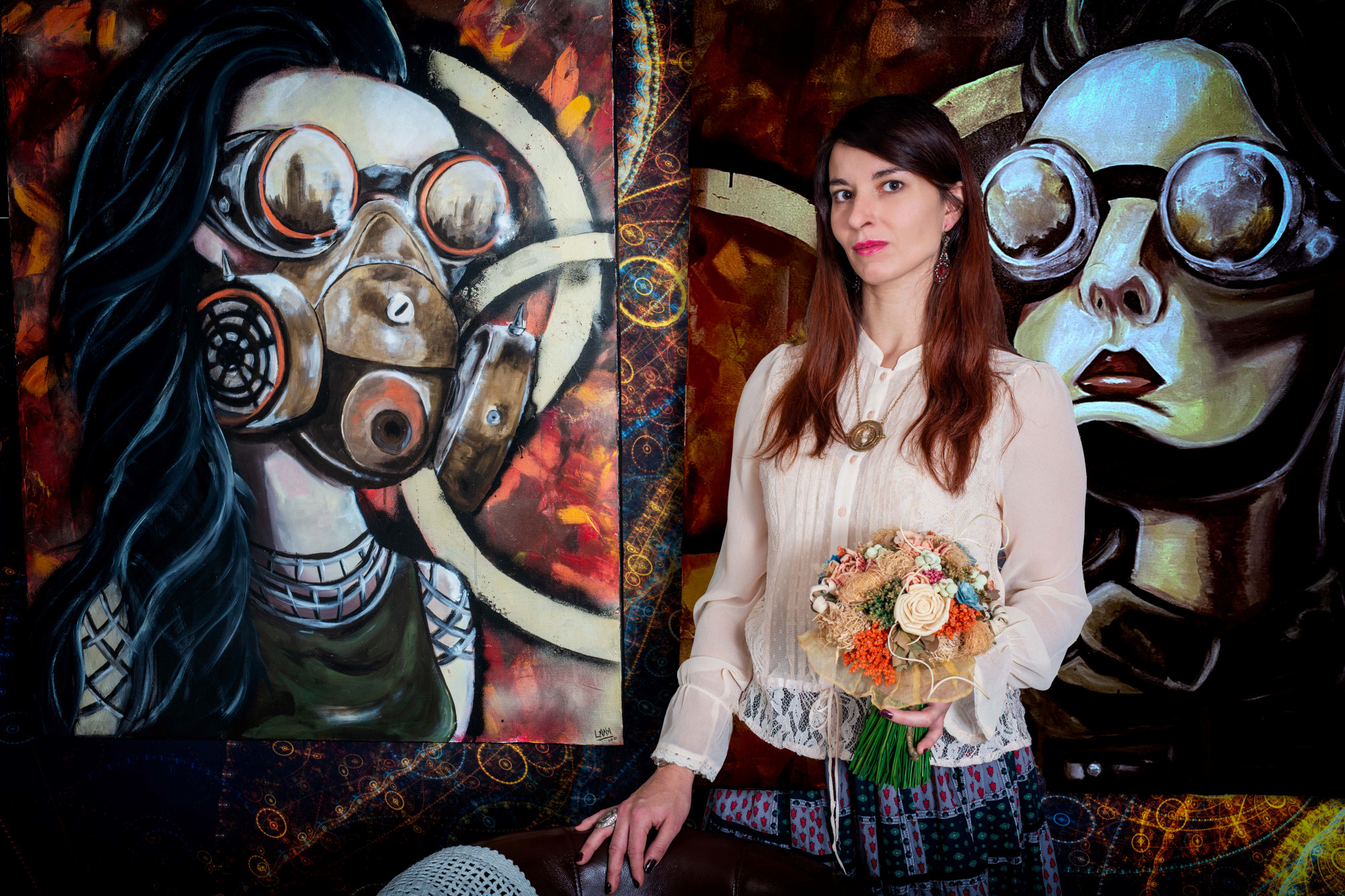 Sur le mur derrière elle, trois de ses peintures les plus récentes attirent l'attention. À gauche, un homme au visage masqué par un chapeau melon et des lunettes à verres teintés semble observer le spectateur avec une curiosité presque inquiétante. Au centre, une femme portant un masque à gaz, symbole de résilience et de mystère, émerge d'un tourbillon de couleurs chaudes et froides. À droite, un crâne mécanique, mi-humain mi-machine, semble murmurer des secrets oubliés.