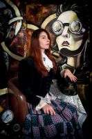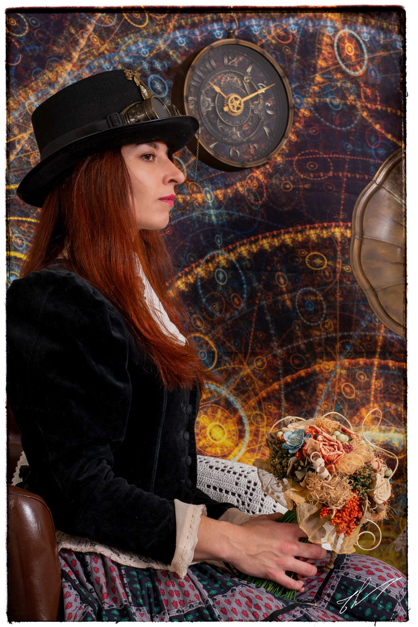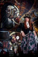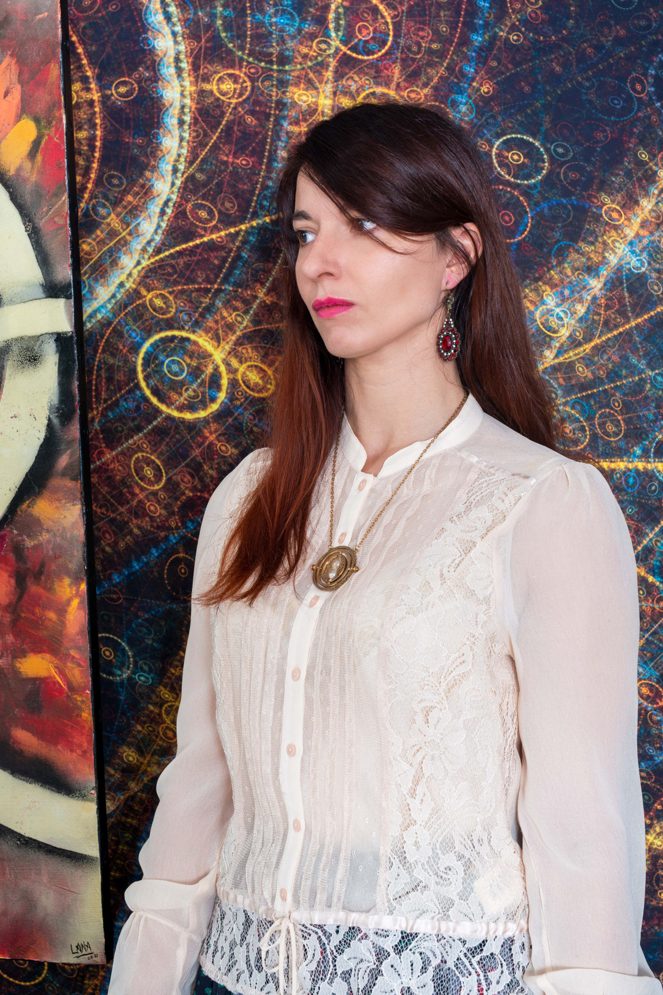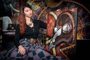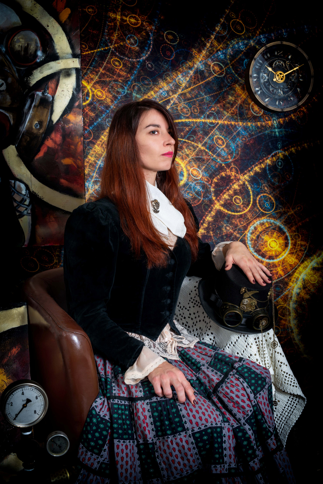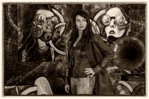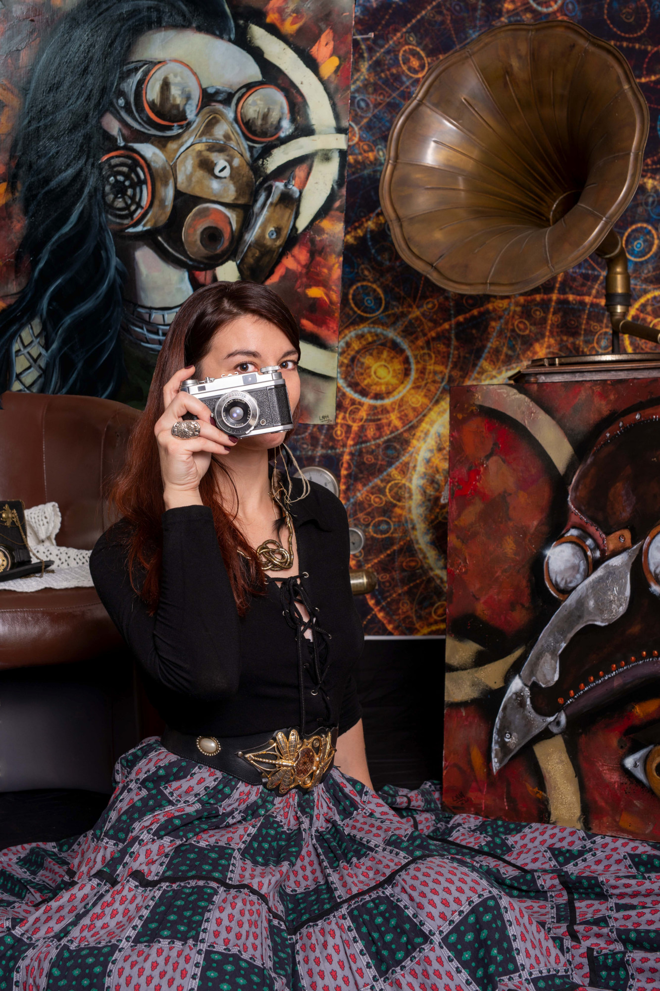 Sur le mur derrière elle, trois de ses peintures les plus récentes attirent l'attention. À gauche, un homme au visage masqué par un chapeau melon et des lunettes à verres teintés semble observer le spectateur avec une curiosité presque inquiétante. Au centre, une femme portant un masque à gaz, symbole de résilience et de mystère, émerge d'un tourbillon de couleurs chaudes et froides. À droite, un crâne mécanique, mi-humain mi-machine, semble murmurer des secrets oubliés.