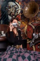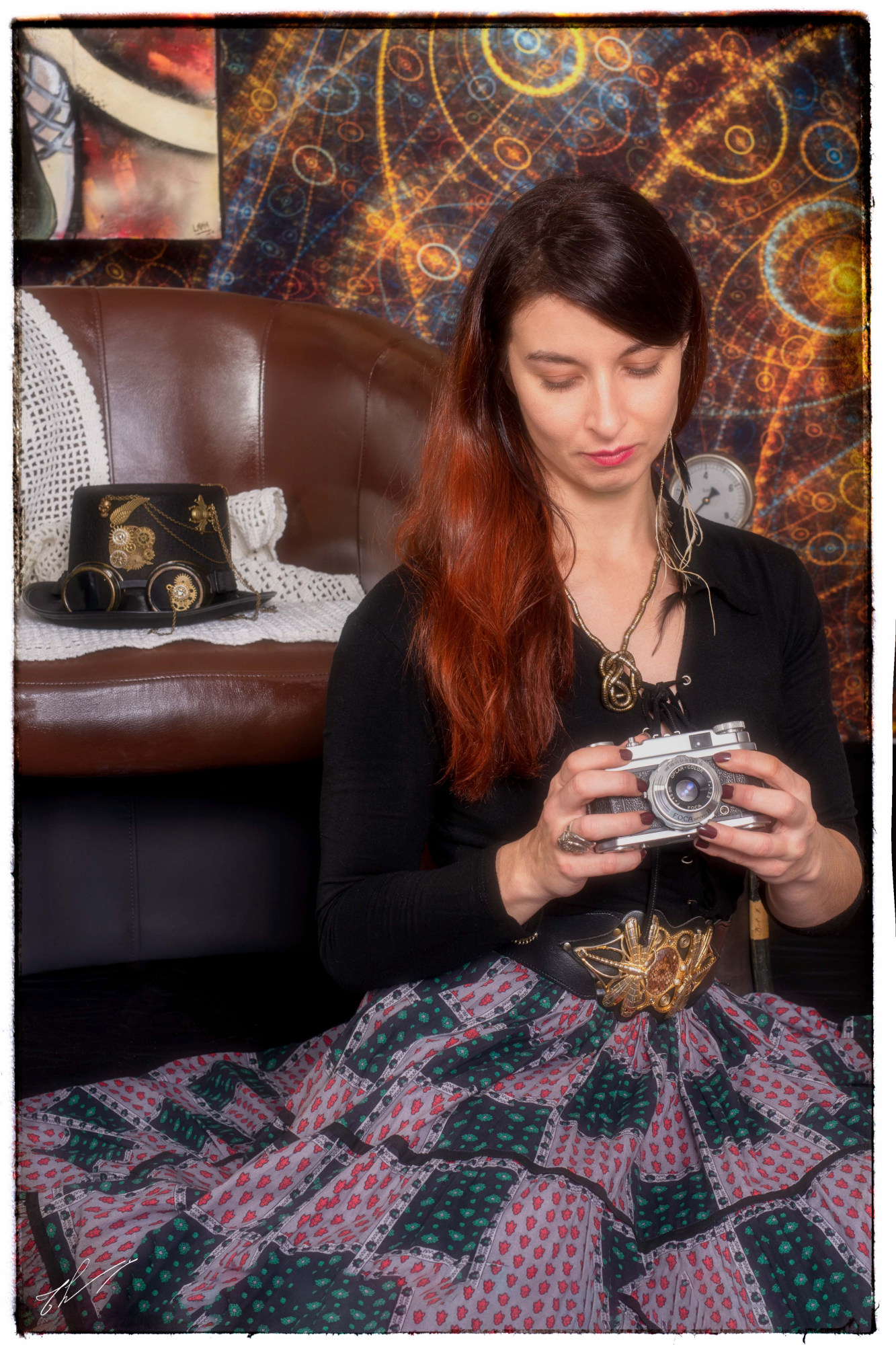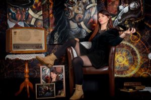 Lana, vêtue d'une robe noire qui contraste avec la lumière dorée filtrant à travers les vitraux poussiéreux, est assise dans un fauteuil en cuir usé. Ses bottes en cuir beige, légèrement éraflées, témoignent des longues heures passées à arpenter les rues à la recherche d'inspiration. À ses pieds, un petit tabouret en bois supporte un vieux poste de radio, un vestige d'une époque révolue, qui diffuse une mélodie douce et nostalgique.